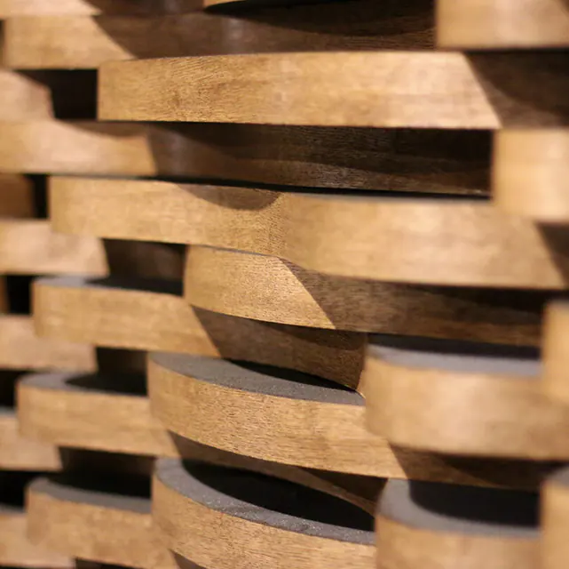 Skontaktuj się z nami, a wykonamy ustroje akustyczne na wymiar, dopasowane do Twojego wnętrza. Mogą one zostać wybarwione na dowolny odcień, pod warunkiem że będzie on ciemniejszy niż naturalny kolor bazowy. W jaśniejszych wersjach, na przykład białych, warstwa segmentów z drewna dębowego może zostać zastąpiona wysokiej jakości warstwą z tworzywa sztucznego, przy zachowaniu dębowej ramy.